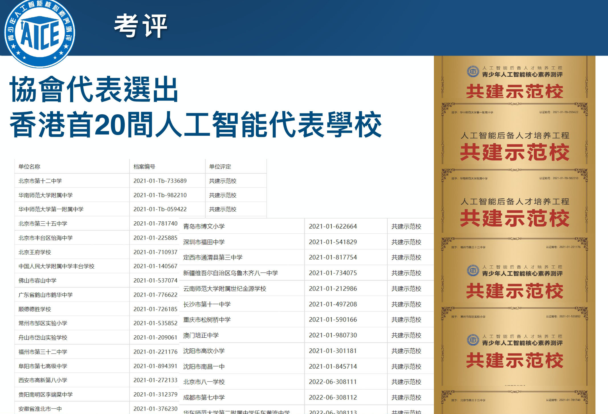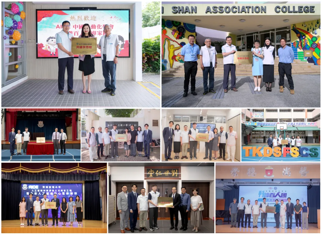 26⽇下午及27⽇,中國⾃動化學會的專家們⾛進⾹港的數所中⼩學,考察當地STEAM及⼈⼯智能教育的發展情況與設備環境,並在與校⽅的會晤 中分享了⼼得及建議。在各場交流的尾聲,「科普百⼈團」的專家代表中國⾃動化學會分別向幾所學校授予「⻘少年⼈⼯智能核⼼素養測評(AICE) 共建示範校」牌匾,鐘聲學校⿆美茵副校⻑、臺⼭商會中學梁少珍副校⻑、獻主會聖⺟院書院唐嘉明校⻑、油麻地天主教⼩學(海泓道)陳淑儀校⻑、 天主教領島學校李安迪校⻑、東莞同鄉會⽅樹泉學校曾英賢校⻑、⿈埔宣道⼩學李德衡校⻑、樂善堂王仲銘中學陳家⿓副校⻑、⾹港聖公會何明華會督 中學STEAM教學資源站負責⼈莊坤霖作為校⽅代表完成了授牌儀式。